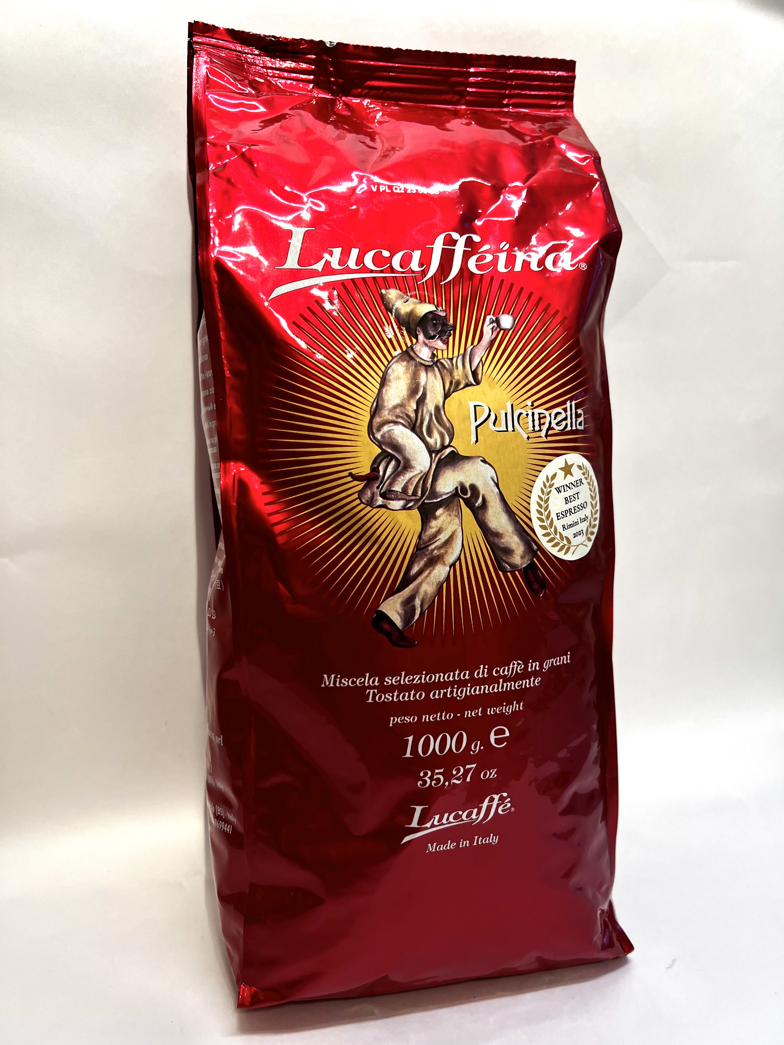 Beskrivelse Pulcinella-blandingen er designet for å ha et høyt koffeininnhold, mer enn gjennomsnittet av Lucaffe sine andre blandinger. Lucaffé Pulcinella, den fantastiske energidrikken som gir deg all energien du trenger i en enkelt kopp ekte italiensk espresso. Intens, sjokoladesmak og en misunnelsesverdig krema! Denne bønnen lager vår sterkeste kaffe, det er en bønnevariant som ble funnet i en av gårdene Lucaffe får kaffe fra i Afrika. Opprinnelig var det så mye robusta i blandingen at det ble ansett som udrikkelig, men etter noen eksperimentering med å blande den med forskjellige arabica typer, var de i stand til å finne balanse for 'bønne x'. Dette har resultert i en kaffe som er uvanlig rik på koffein og har en intens, mørk og robust smak. Den er napolitansk brent og har en veldig intens kropp. Leveres i kilos poser med enveis ventil. |