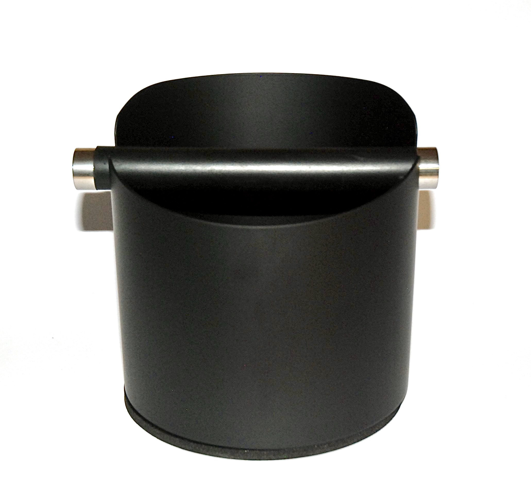 Sort solid metall dunkeboks. 14,1 cm høy og har en diameter på 14,1 cm.